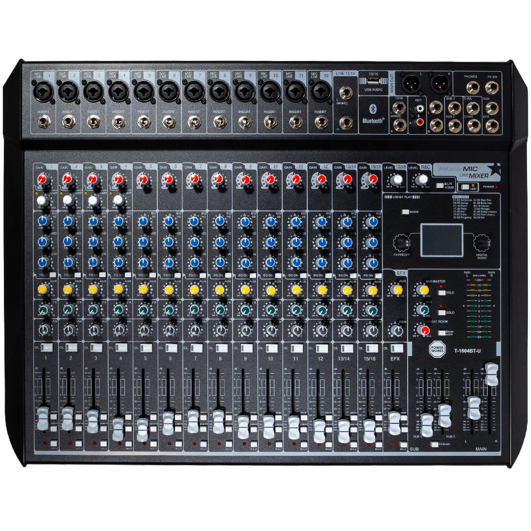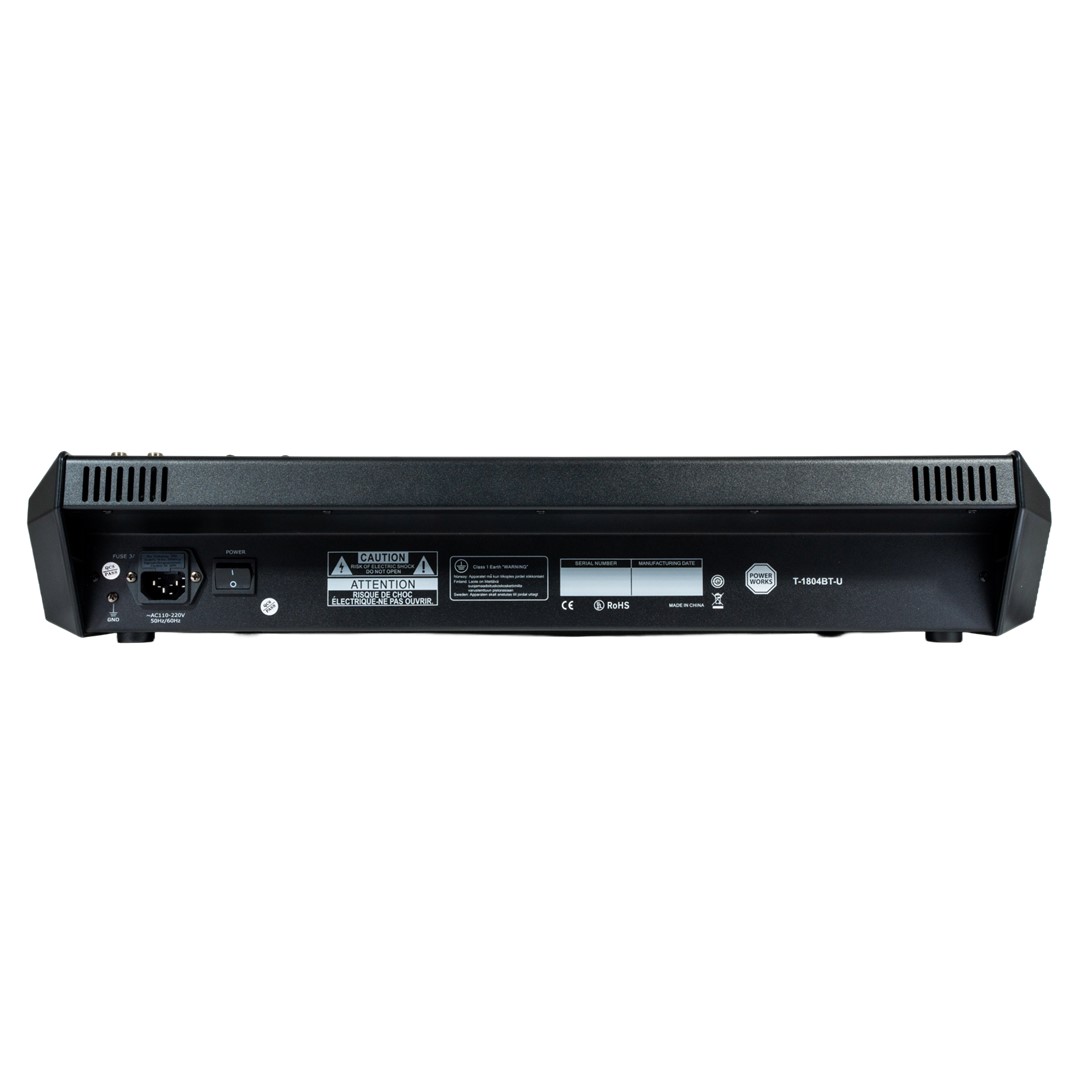 The PowerWorks T-1804BT-U is an 18-input analogue mixer designed for professional audio production.