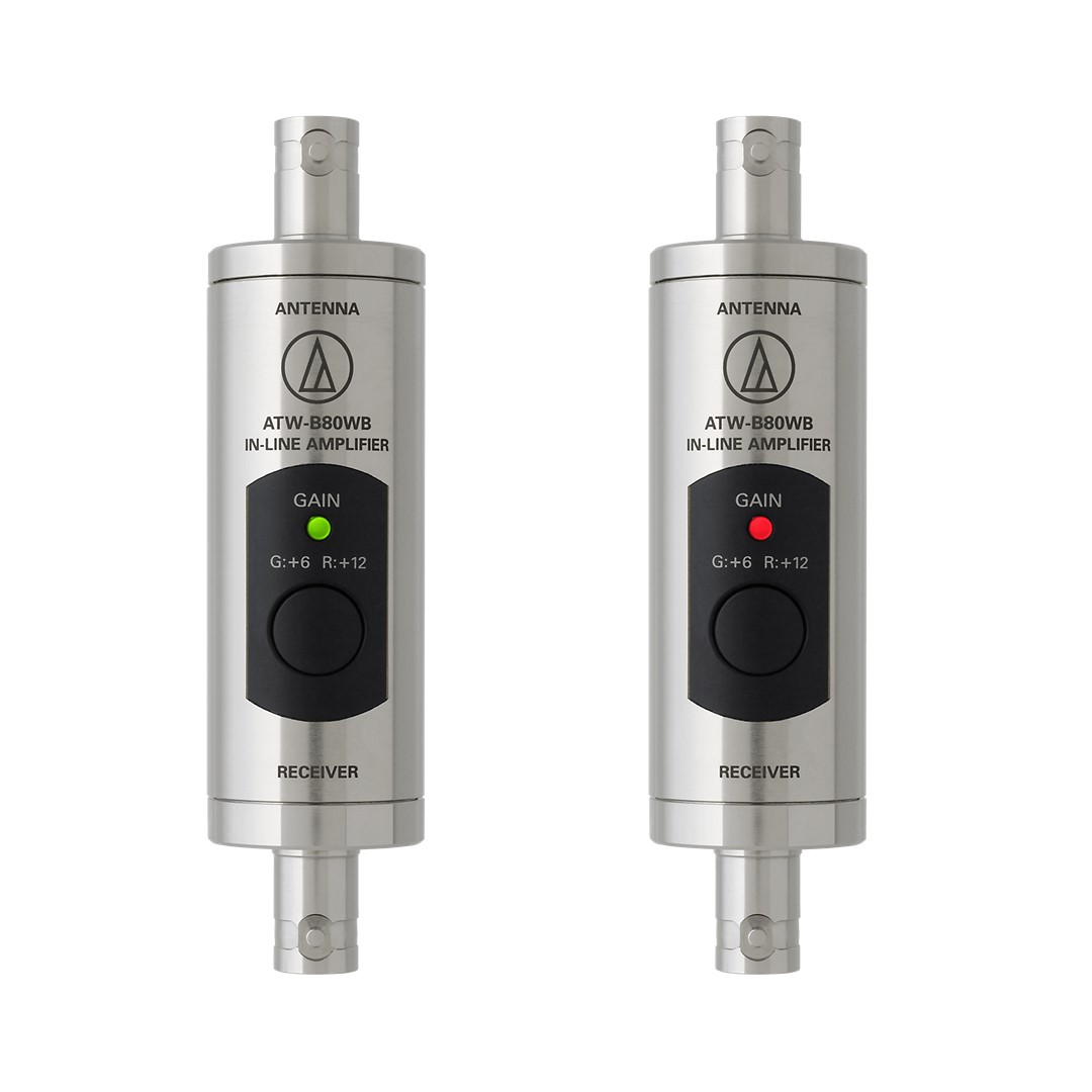 The Audio-Technica ATW-B80WB In-Line RF Boosters enhance wireless audio performance by increasing RF signal strength for UHF frequencies ranging from 470 to 990 MHz. With a selectable gain switch for 6 dB or 12 dB, these boosters effectively compensate for antenna cable loss. Designed for seamless integration with Audio-Technica UHF receivers and RF Venue antenna systems, they ensure reliable audio transmission in various professional environments.