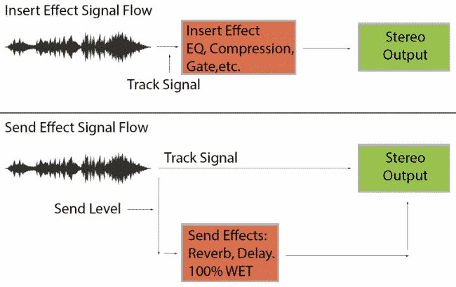 - The signal from a track goes two ways: (1) to the stereo output bus or interface output, and (2) to an effects bus.