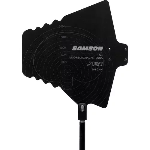 The pair of PA1 Active Unidirectional Antennas from Samson are log-periodic dipole array (LPDA) antennas that are designed to improve wireless reception. They can be used to focus the pickup pattern towards the desired coverage area increasing the overall range of your wireless system and reducing unwanted RF from surrounding locations and sources.