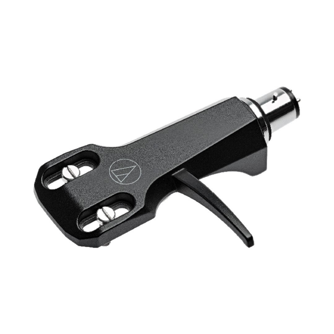 The Audio-Technica AT-HS6BK Universal Headshell features a lightweight aluminum body, precise finger lift, and high-quality gold-plated lead wires. It supports ½"-mount cartridges and includes mounting screws for easy installation. Available in black and silver, this headshell enhances both performance and aesthetics.