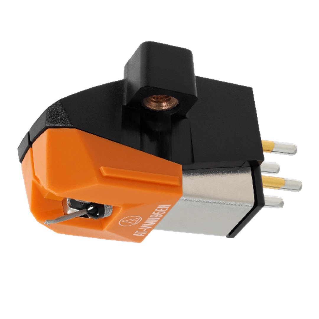 The Audio Technica AT-VM95EN Dual Moving Magnet Cartridge features a 0.3 x 0.7 mil elliptical nude stylus for precise tracking and excellent sound quality. Designed for half-inch mount turntables, it provides a robust output level of 3.5 mV, outstanding channel separation, and low distortion. Its low-resonance housing includes threaded inserts for easy installation with just two screws. Compatible with six interchangeable AT-VMN95 replacement styli, this cartridge offers durability and flexibility for both casual and serious listeners.