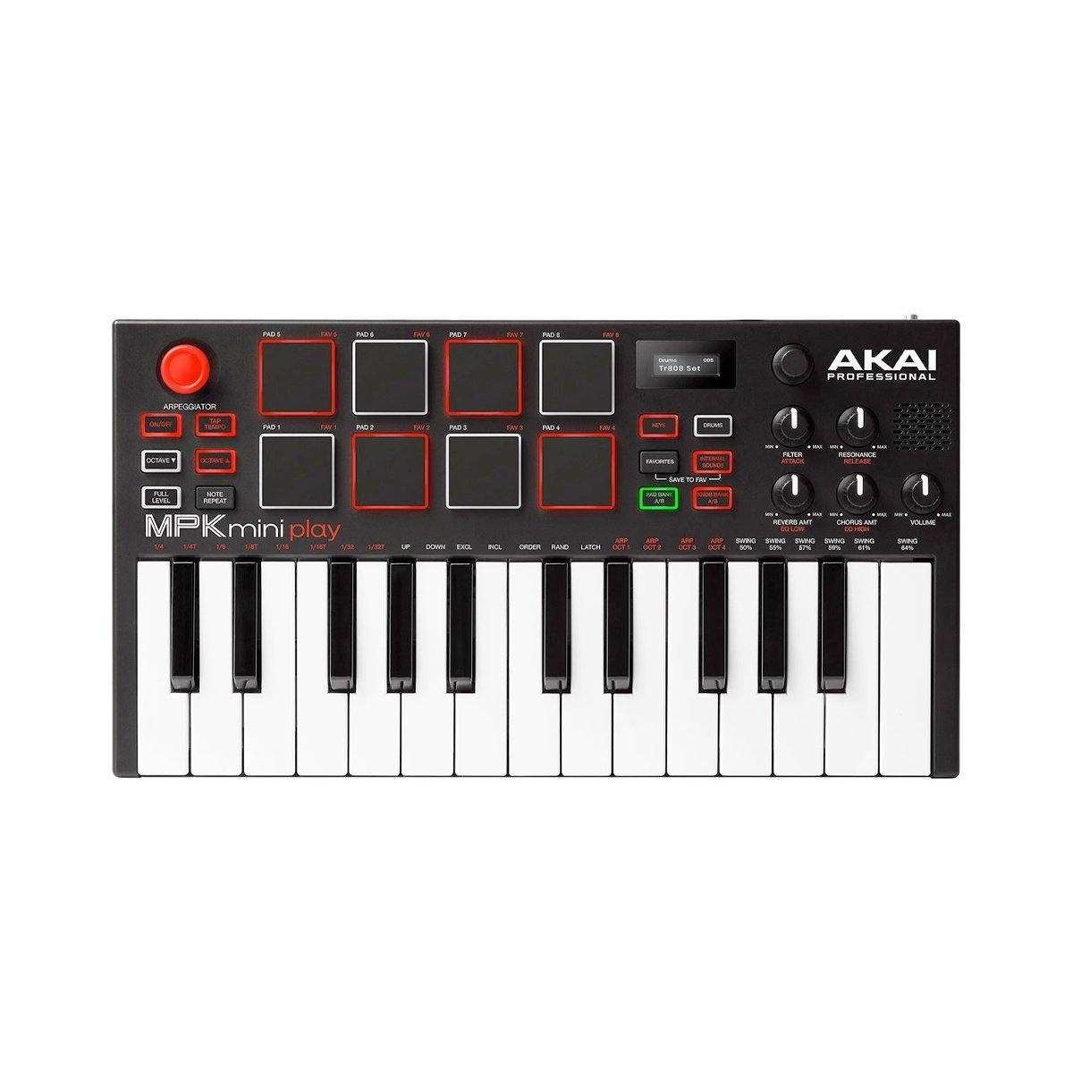 Compact Keyboard/Pad Controller with Integrated Sound Module Built-In Sound Module with 128 Sounds 25 Velocity-Sensitive Keys 8 Backlit Pads 4 Knobs for Sound Edit or MIDI Controls Pitch/Modulation 4-Way Thumbstick Arpeggiator USB MIDI and Power Can Be Powered by 3 x AA Batteries Sustain Pedal Input + Headphone Output Mac OS X / Windows The ultra-portable MPK Mini Play is based on the world’s most popular midi controller
